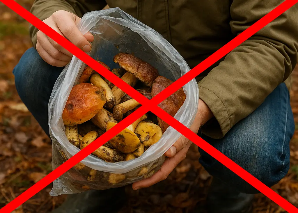 Du solltest niemals Plastiktüten nutzen um Pilze zu sammeln oder zu transportieren. Dort bildet sich schnell ein feuchtwarmes Milieu unter dem Pilze besonders schnell verderben. So droht schnell eine Lebensmittelvergiftung!